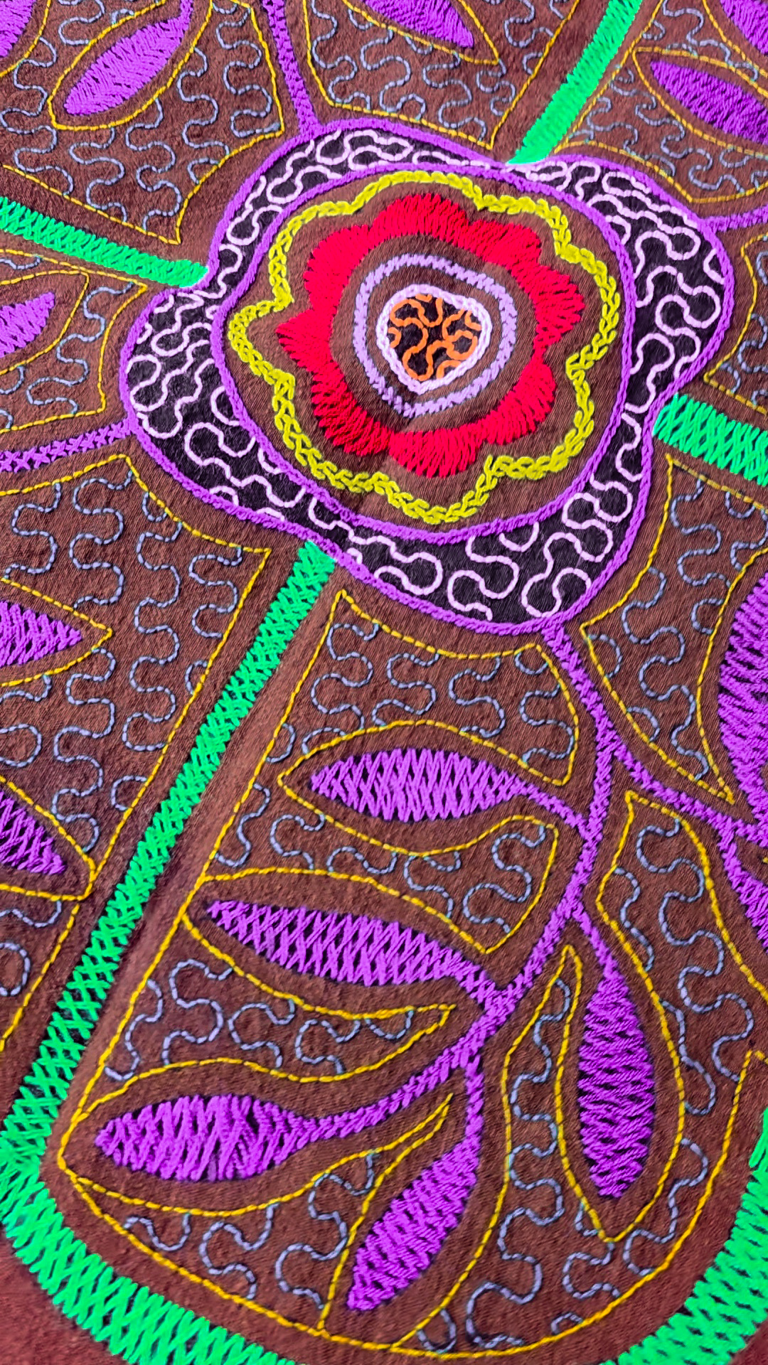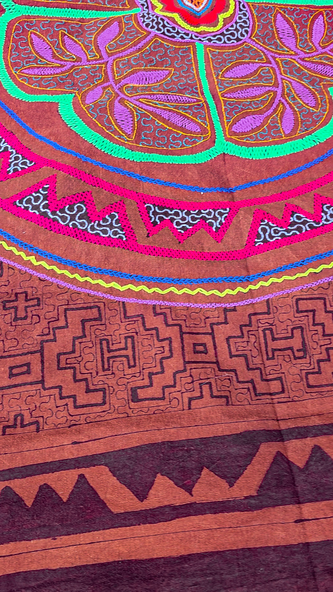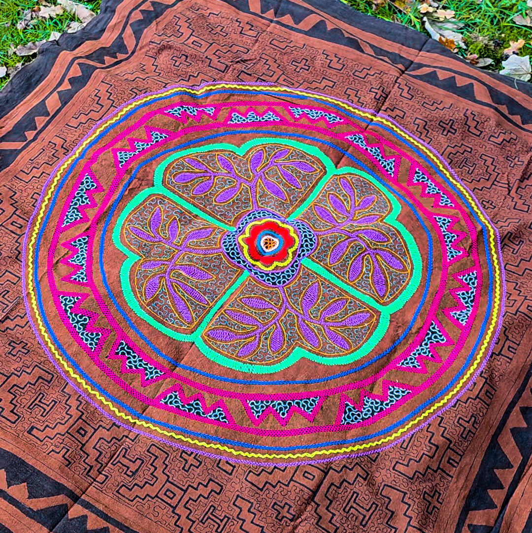 It’s a very vibrant piece of art, made by a Shipibo artisan in Pucallpa. We directly support a Shipibo association set up by a Shipibo woman in Pucallpa in order to give the Shipibo women who are embroidering, a trade and a way to sell their amazing work.