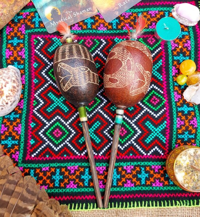 In South America, the shaman’s rattle is a most sacred instrument. The rattle is believed to embody the sacred forces of the cosmos through its sounds, structural features, contents, and connection to shamanic trance.