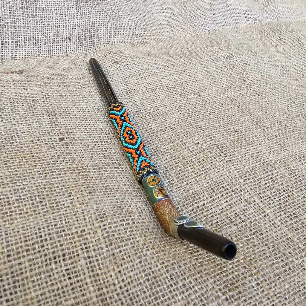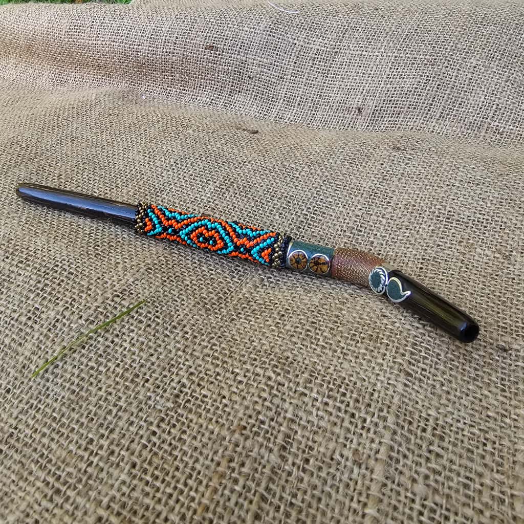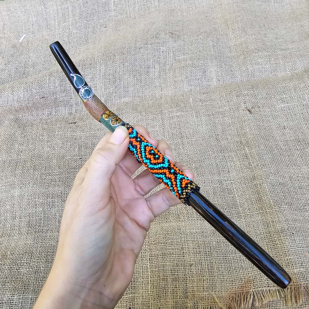 I have a small number of tepi’s handmade by a talented Shipibo artisan. The tepi’s are made from a sustainable source of Madre Chonta wood. The seeds are sacred art and offer protection to the wearer. The patterns are much more than just patterns.