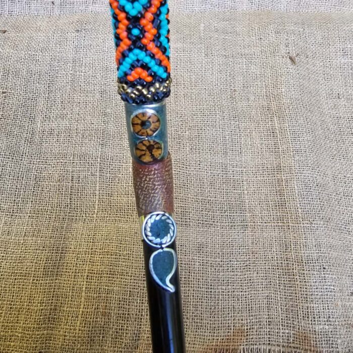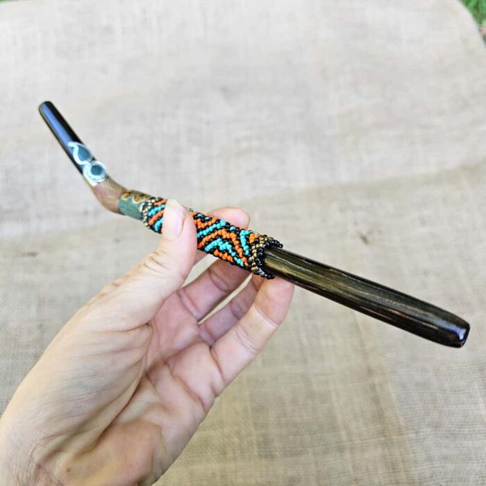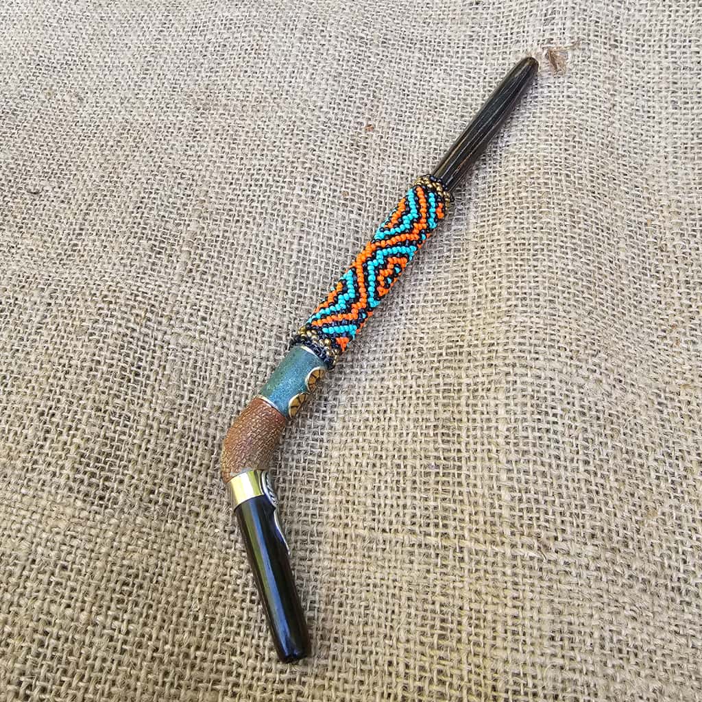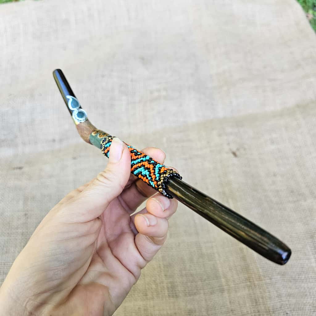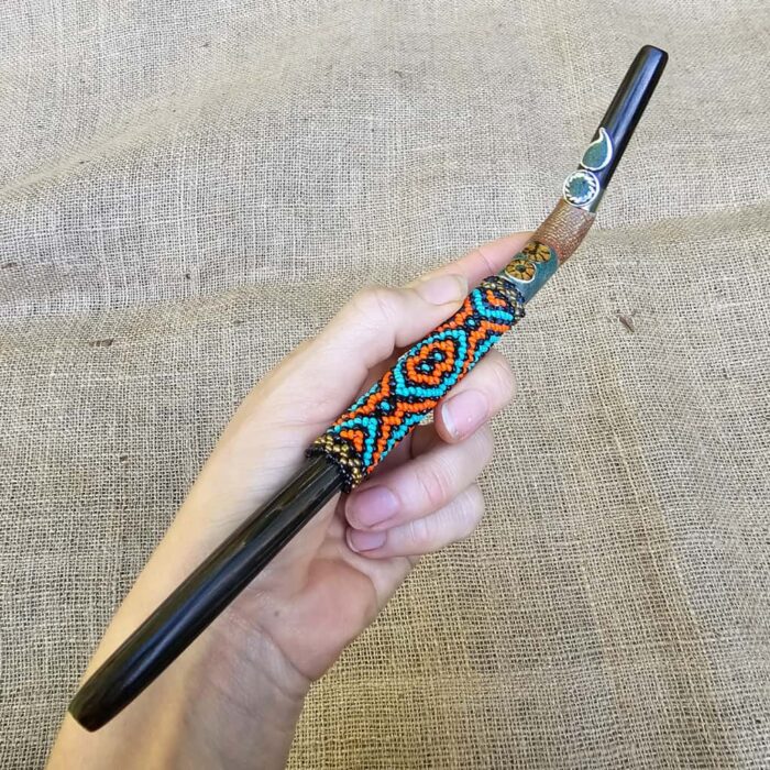 I have a small number of tepi’s handmade by a talented Shipibo artisan. The tepi’s are made from a sustainable source of Madre Chonta wood. The seeds are sacred art and offer protection to the wearer. The patterns are much more than just patterns.