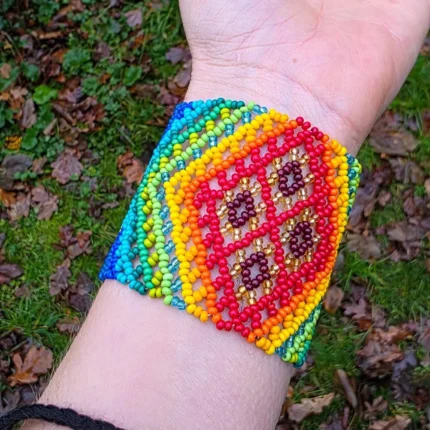 More than a striking accessory, this Parrot Animal Shipibo Cuff is adorned with traditional Shipibo symbols and designs, believed to offer protection against negative energies. Wearing it serves as a spiritual safeguard, while adding a unique touch to your style.