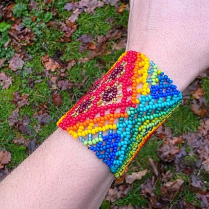 This cuff showcases a vibrant parrot design, a significant animal in the Shipibo-Conibo tribe. Parrots are renowned for their colourful plumage and eloquent mimicry, symbolising communication and vibrancy. They also represent wisdom, guidance, and the power to survive in challenging environments, making this cuff a potent talisman for the wearer.