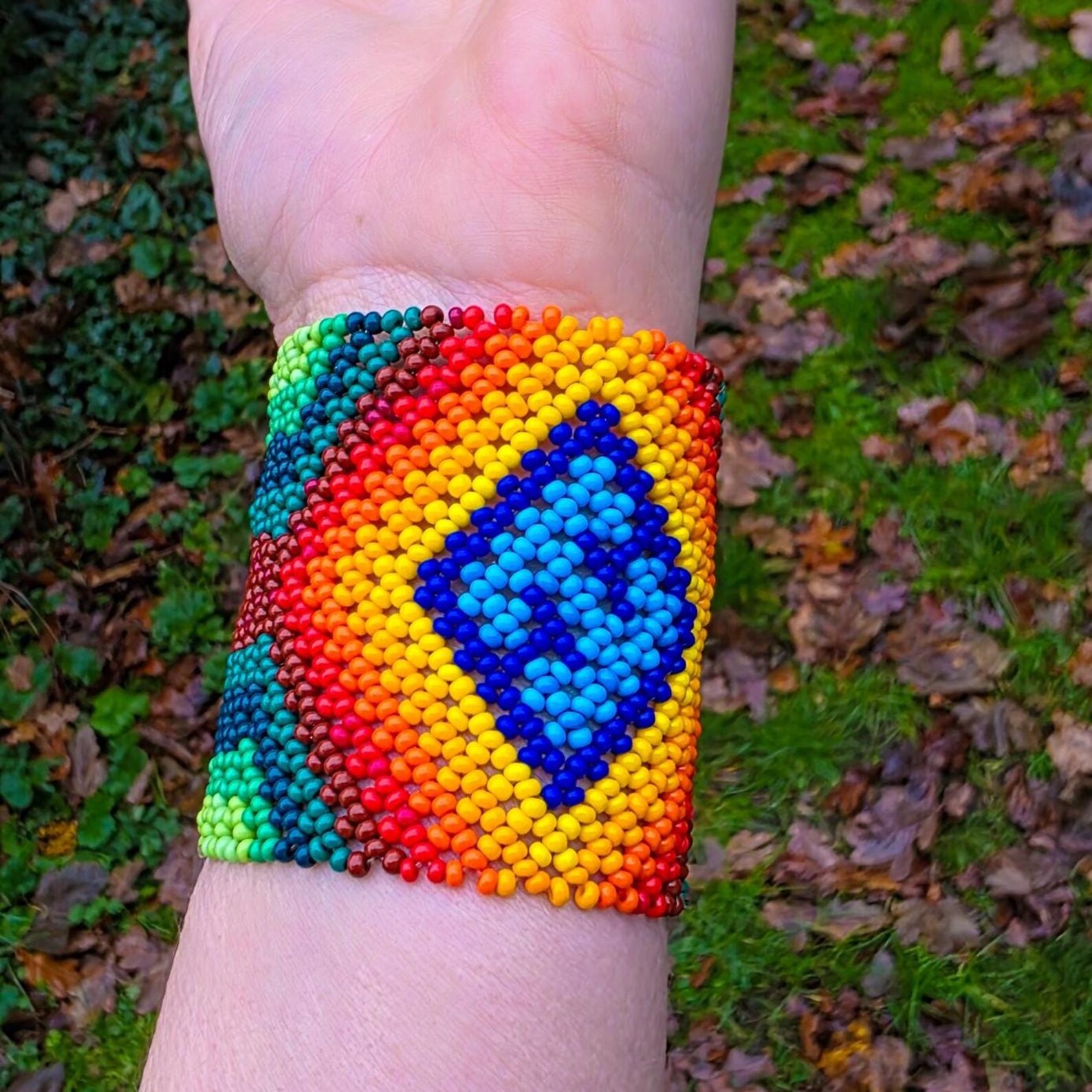 The bracelets are sacred art and offer protection to the wearer. The patterns on the necklace are much more than just patterns.